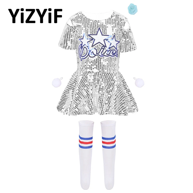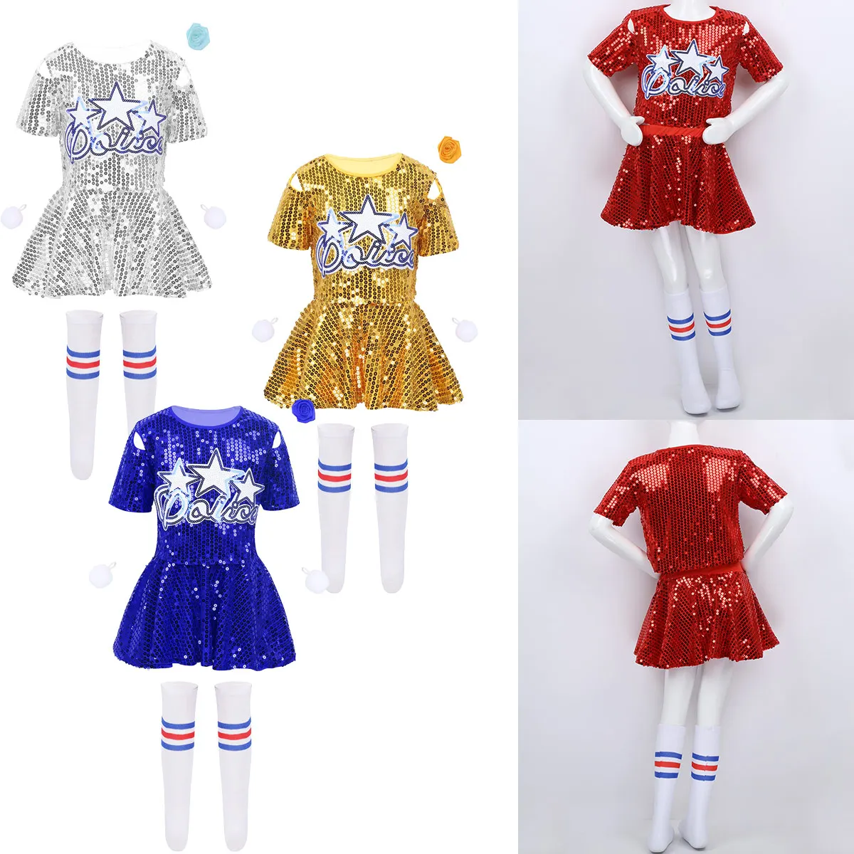 Kids Girls Cheerleading Costume Sparkly Sequins jazz dance costume Short Sleeves Crop Top with Skir