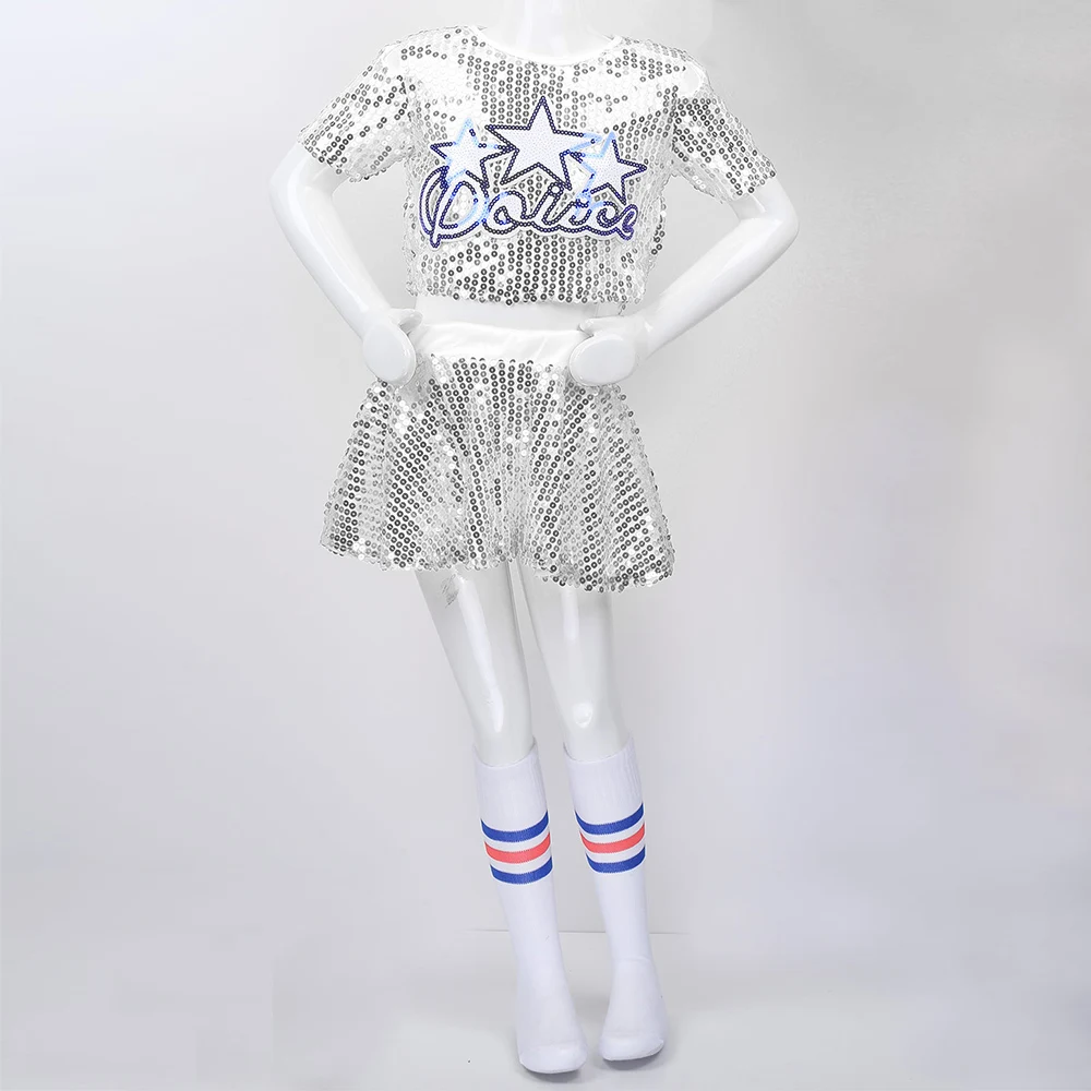 TOP Kids Girls Cheerleading Costume Sparkly Sequins jazz dance costume Short Sleeves Crop Top with Skir
